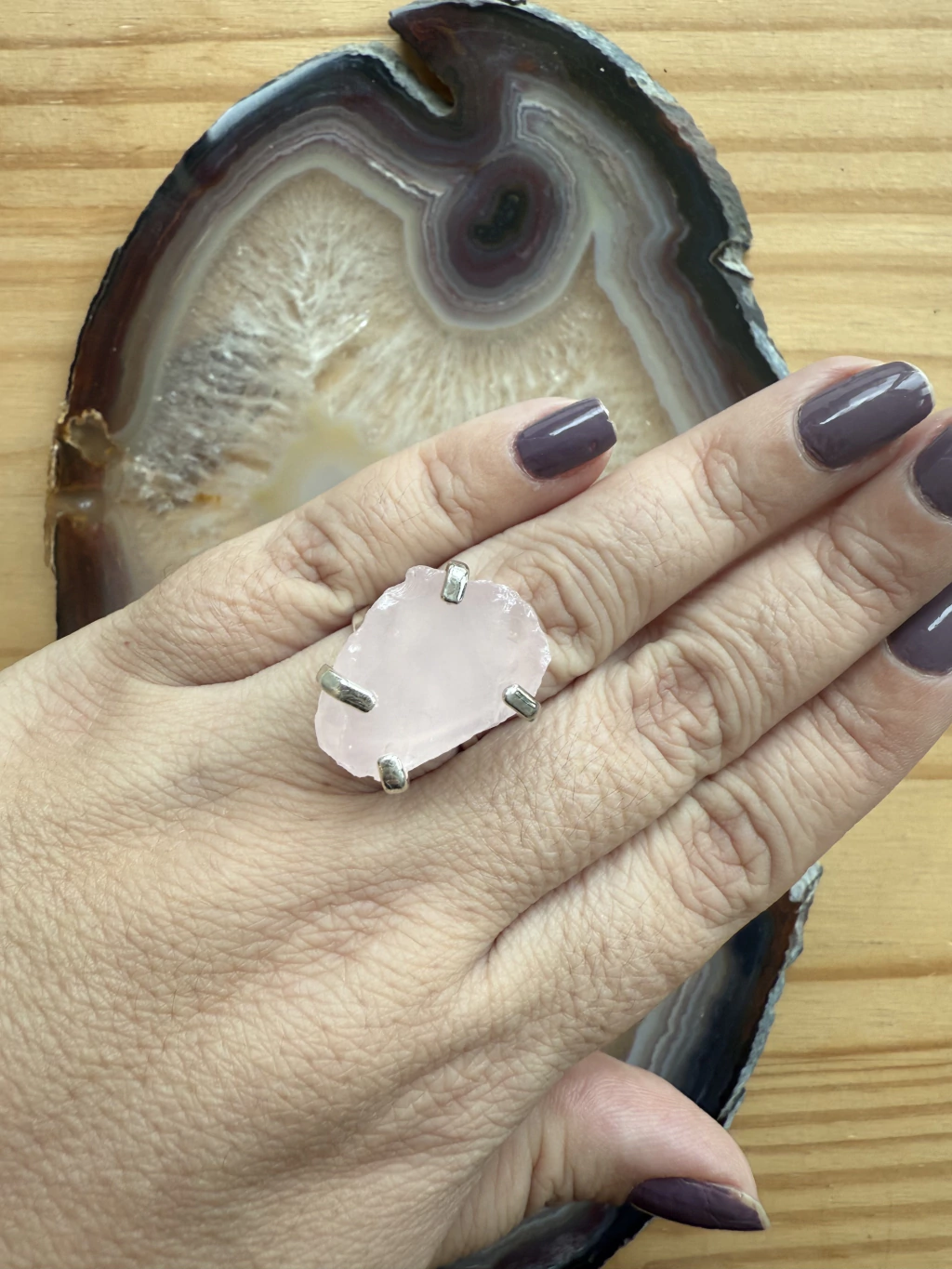 Anel Quartzo Rosa Regulável Banho Prata - Amor