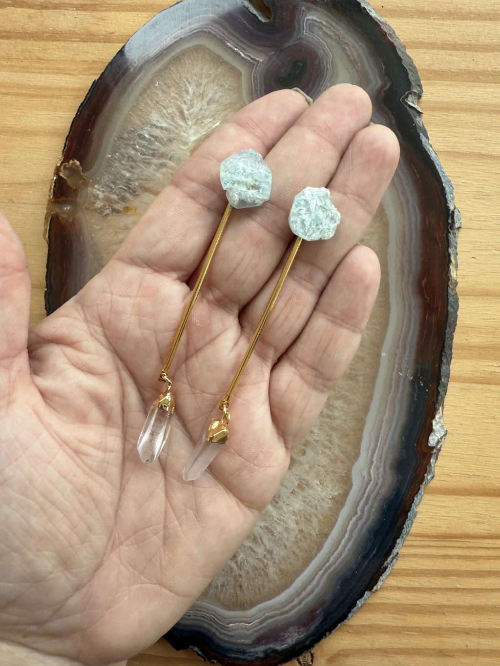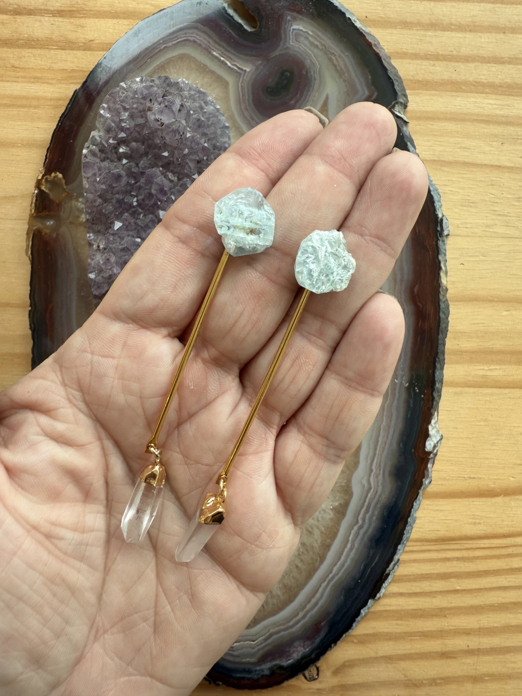 Brinco Água Marinha e Quartzo Cristal Banho Ouro - Felicidade e Iluminação