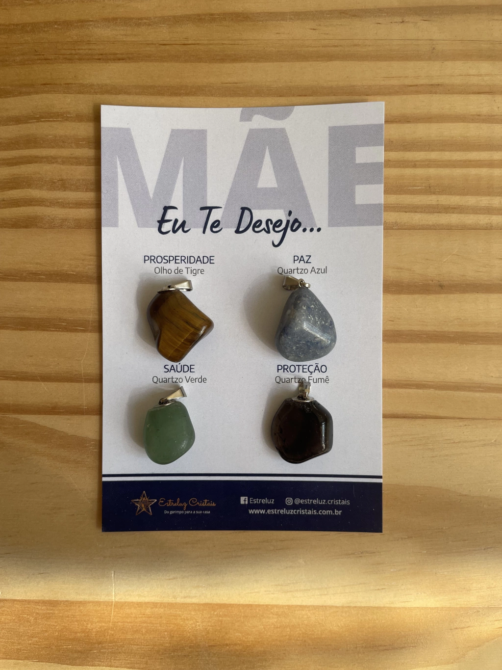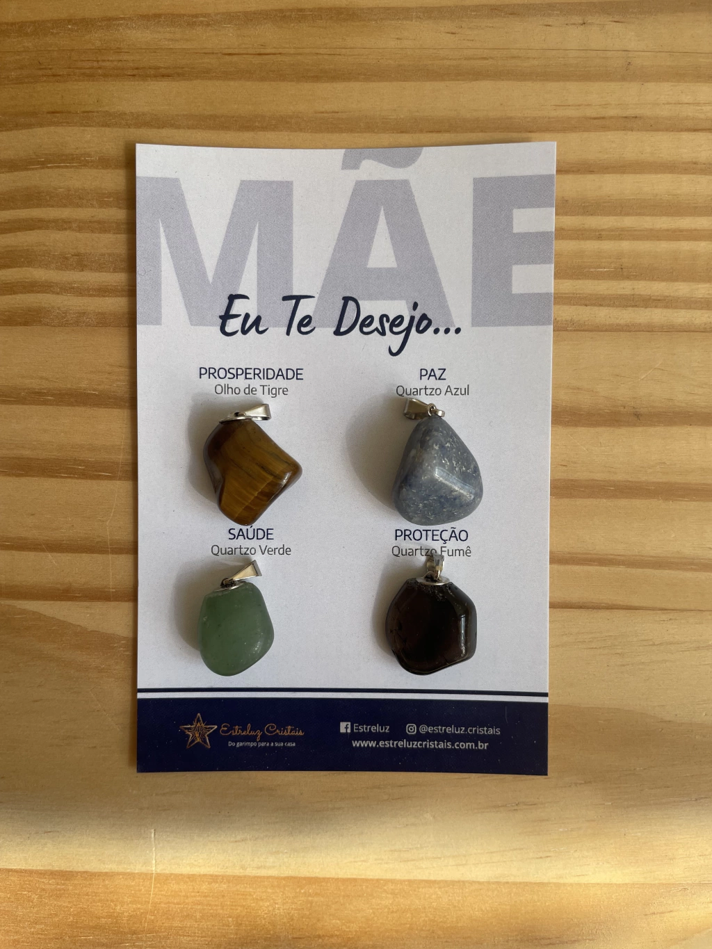 Cartão mensagem de desejos para você presentear sua mãe com 4 pingentes em Cristais 100% naturais com os propósitos energéticos de cada desejo.