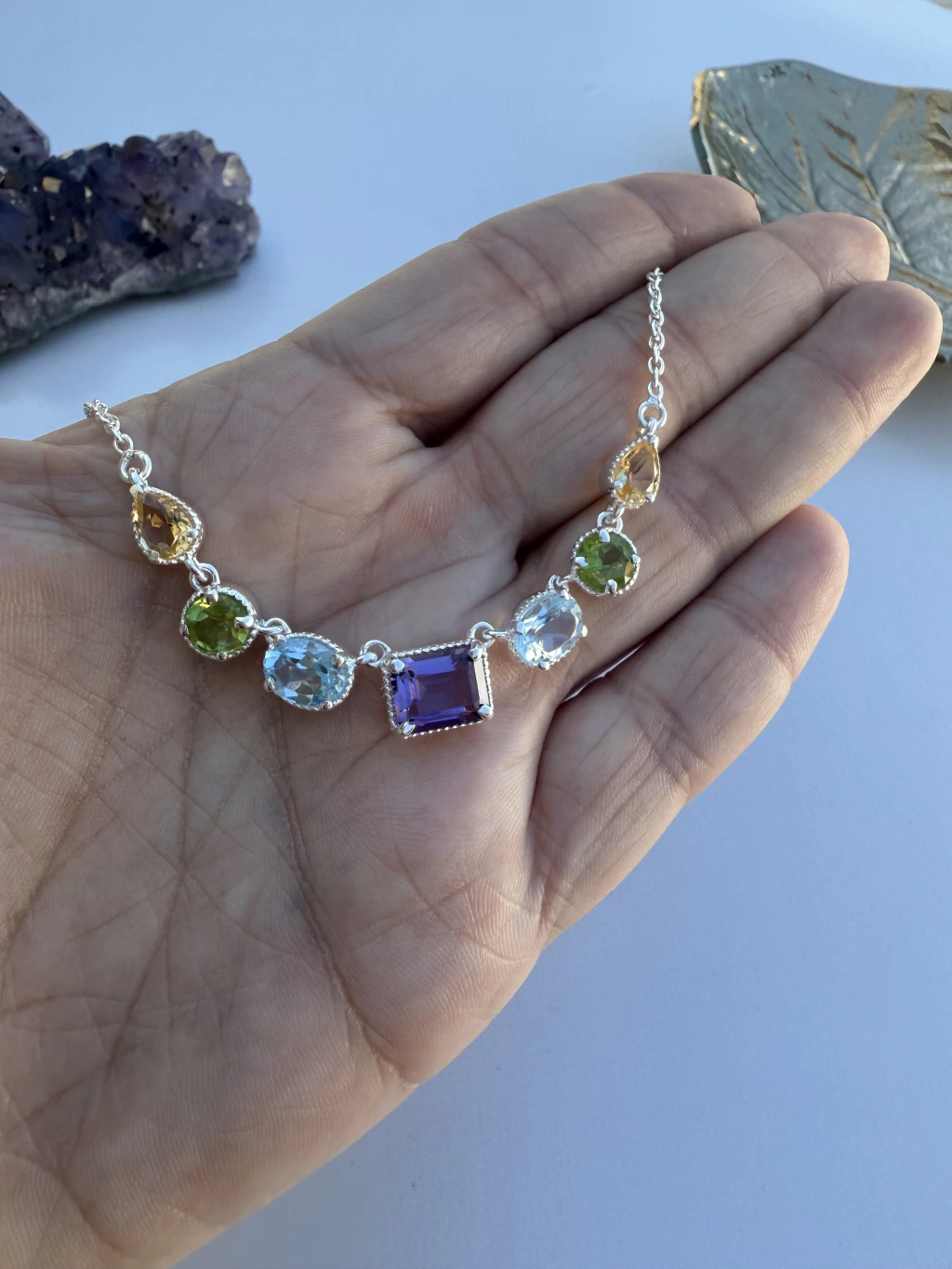 Colar 4 Cristais Facetados em Prata 925 - Topázio Azul, Topázio Imperial, Ametista e Peridoto