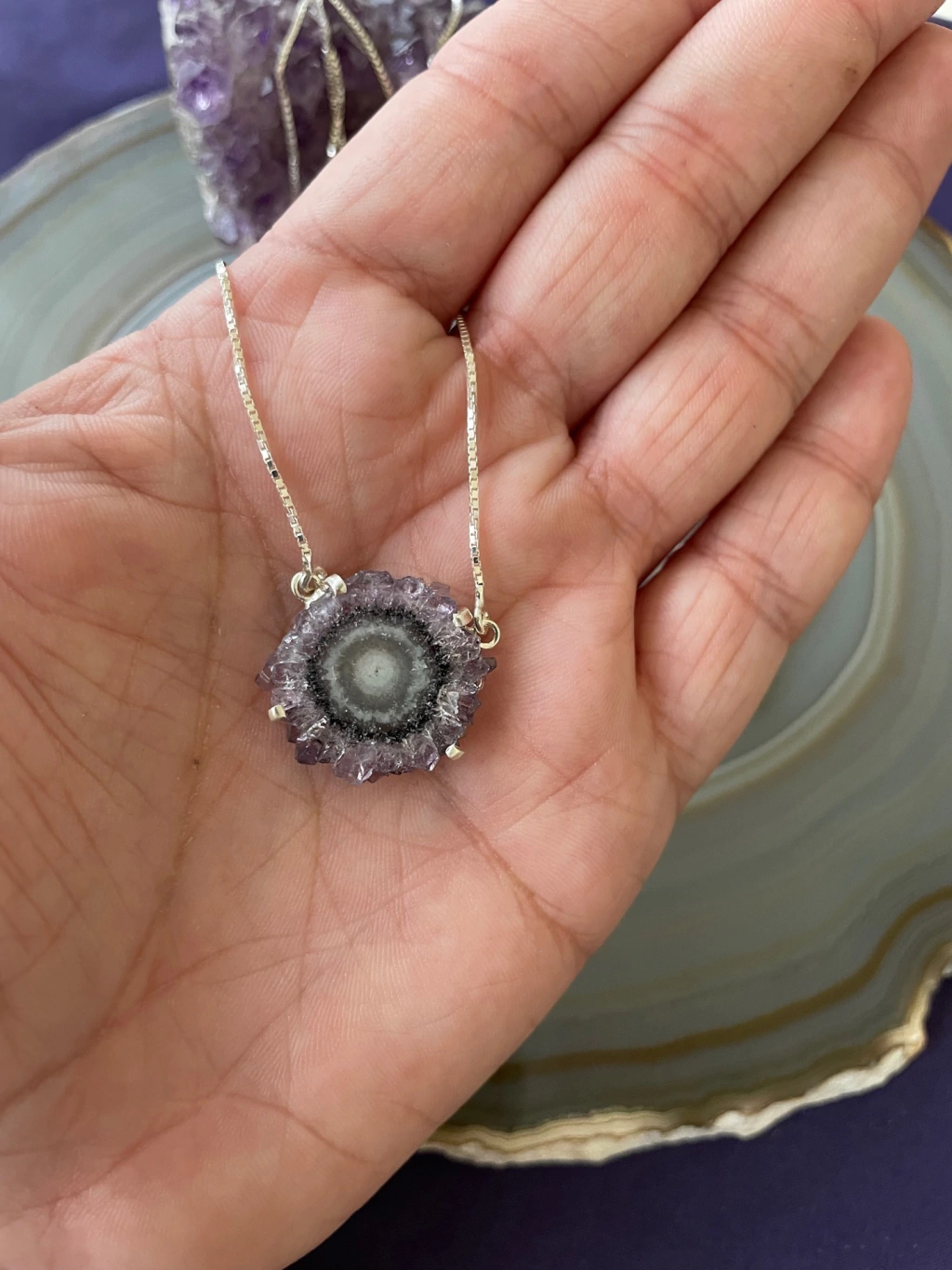 A Ametista é dona de infinita beleza e propriedades transcendentais, pois nos permite atingir os níveis mais profundos de concentração, facilitando a meditação e a tomada de decisões. Na Antiguidade, foi utilizada por magos e sacerdotes como elemento de proteção do espírito. A Ametista também é muito conhecida pelo seu poder de transmutar energias negativas em positivas, transformando as vibrações densas de pessoas e ambientes em energias sutis e harmoniosas. Por sua cor, ela canaliza as energias de cor violeta, que promovem a purificação do corpo físico, ajudando na eliminação de qualquer tipo de malefício presente.