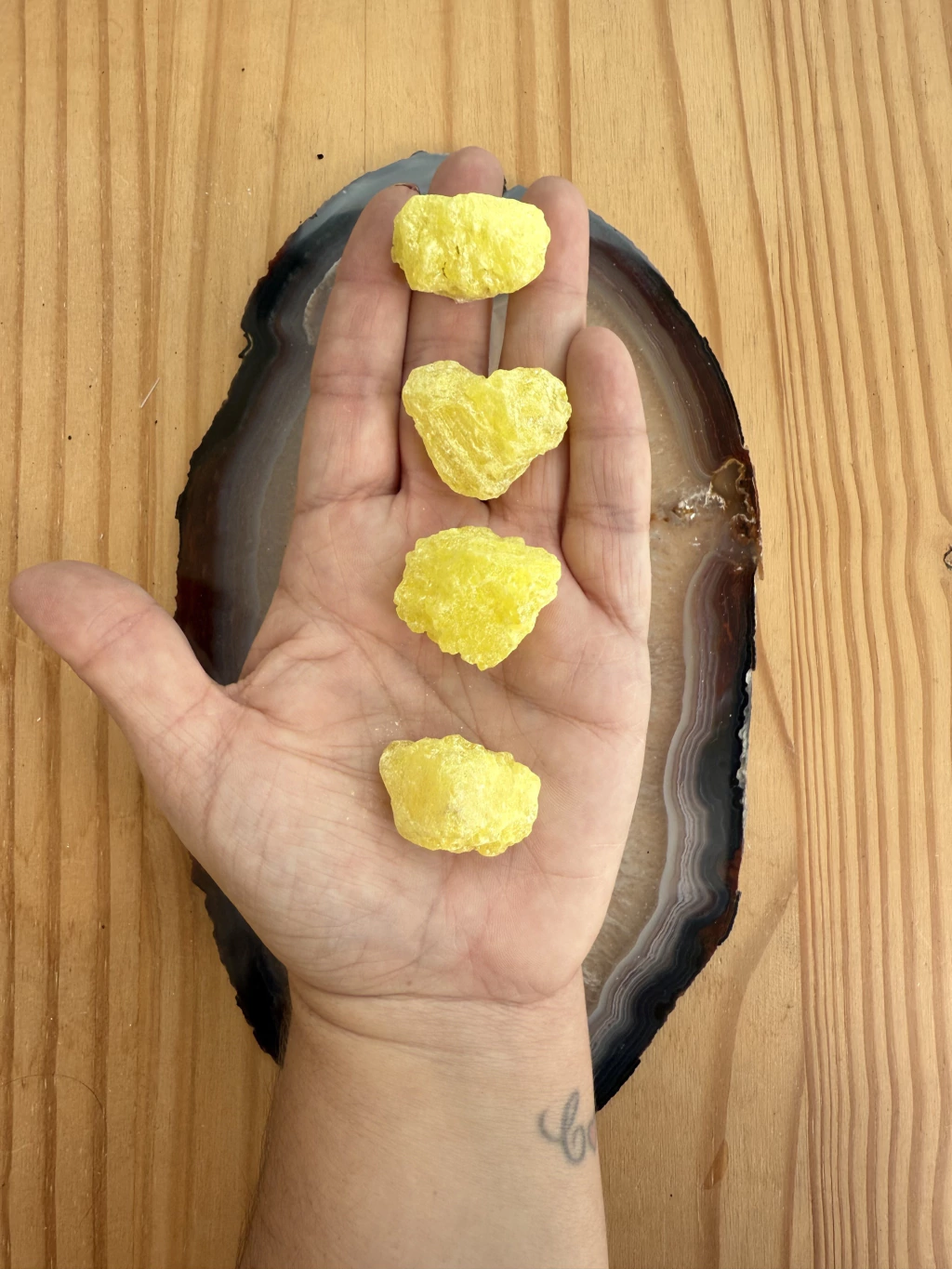 Enxofre é um cristal que absorve todos os tipos de negatividade. Traz compreensão, felicidade, criatividade, nos ajuda a avançarmos nossas capacidades psíquicas e bloqueia pensamentos negativos, nos permitindo assim a usar nosso raciocínio sem interferências. Inspira confiança e nos traz inspiração. Ajuda-nos a viver no momento agora, estimulando a clareza mental, foco e análise. Trata-se de uma pedra que aumenta a intuição e auxilia na disciplina e fortalece a nossa força de vontade, carisma e vitalidade.