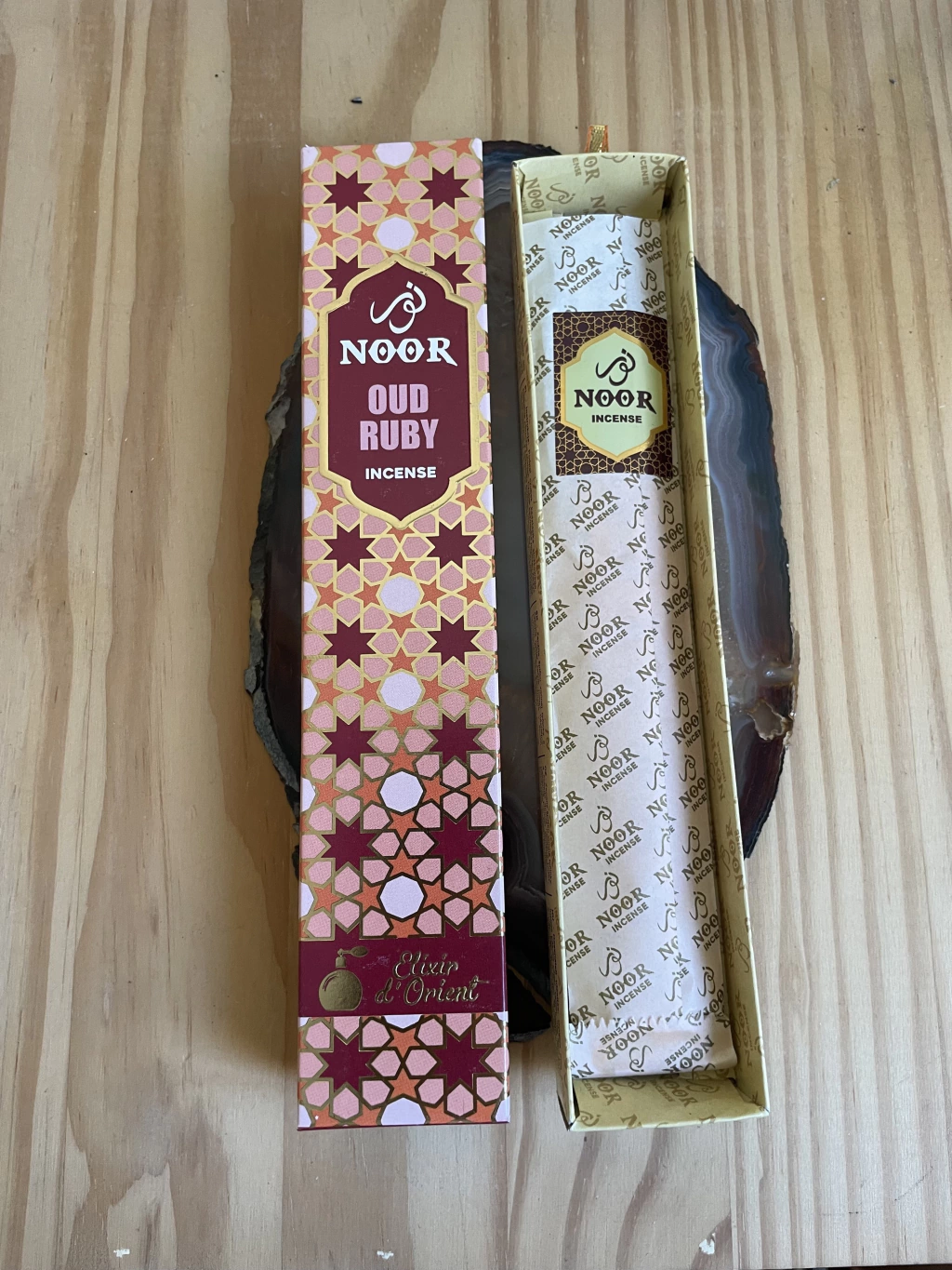 Incenso Massala Oud Ruby Noor proporciona um estado de espírito favorável à introspecção e à espiritualidade, além de harmonizar e purificar ambientes. Deliciosa fragrância Indiana. Beneficio do aroma do Incenso Ruby Noor, composto por ervas naturais como Oud, Rose, Absolute, Geranium, Iris, Berries, funciona como um equilibrador, harmonizando um ambiente, limpando as energias negativas e atraindo bons fluidos.