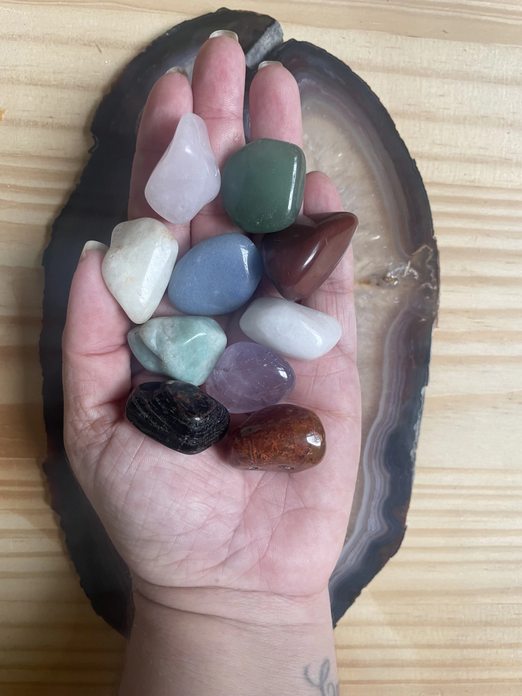 Kit com 10 cristais rolados, contendo 1 cristal de cada um dos descriminados abaixo, com tamanho até 2cm e todos selecionados especialmente para você.