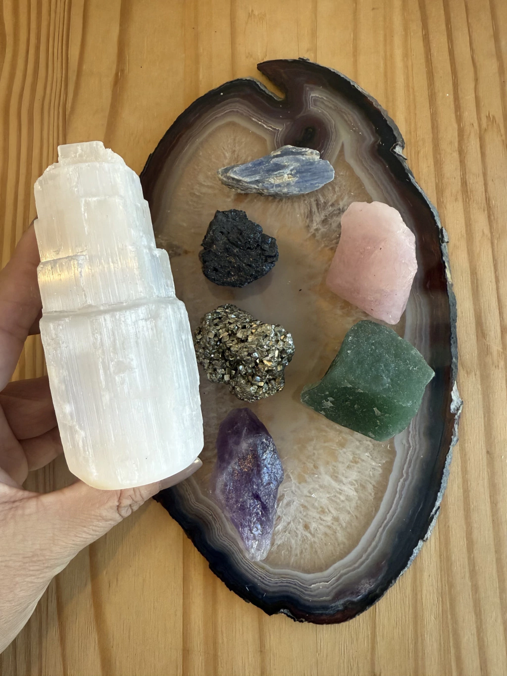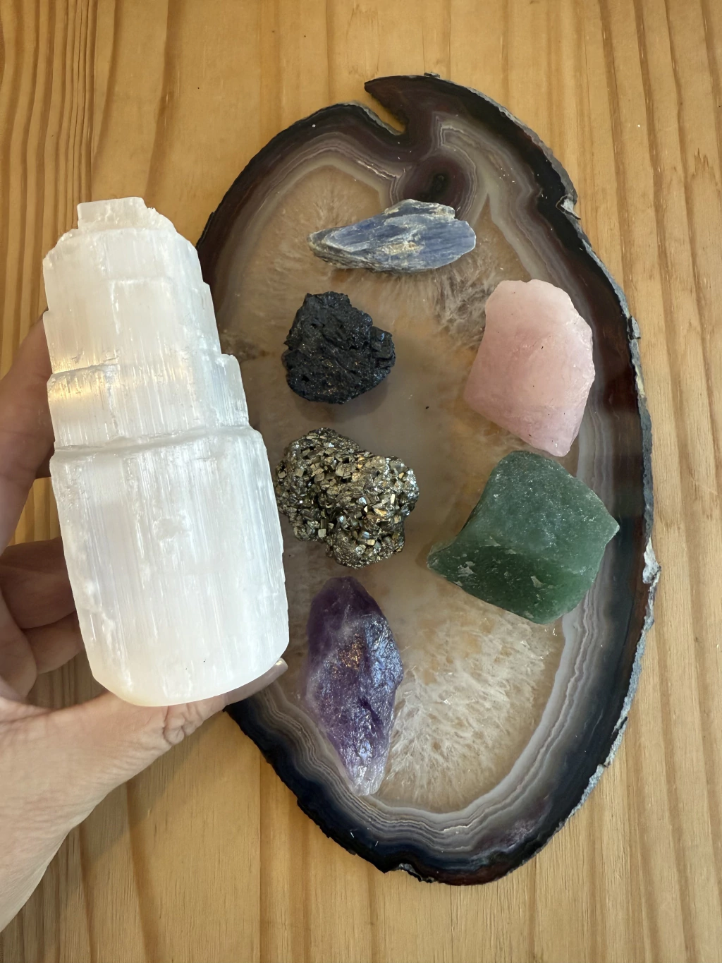 Contém: 1 Turmalina Negra, 1 Quartzo Rosa, 1 Quartzo Verde, 1 Pirita, 1 Cianita Azul, 1 Ametista e 1 Torre de Selenita.