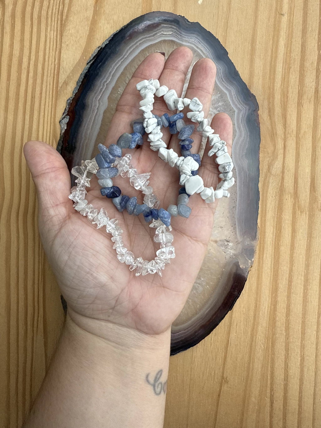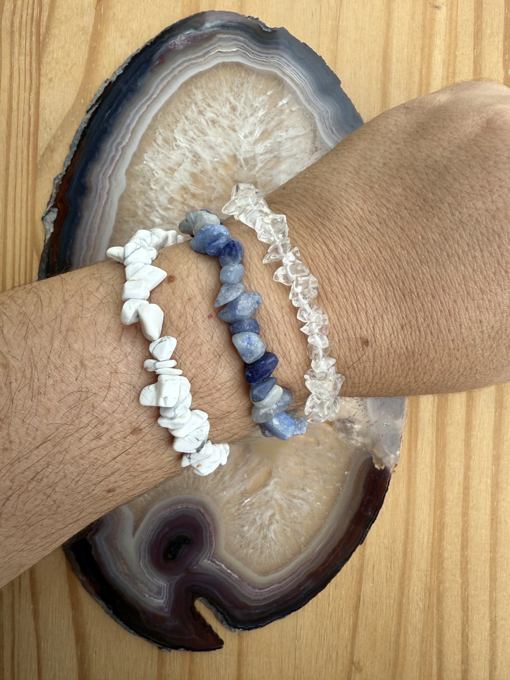 Quartzo Azul - Sabedoria, discernimento, paz, calma, foco, determinação e objetividade. Promove nossa ligação com os anjos. Nos traz segurança, proteção, paciência, tolerância e compreensão. Atua no 5º Chakra Laríngeo.