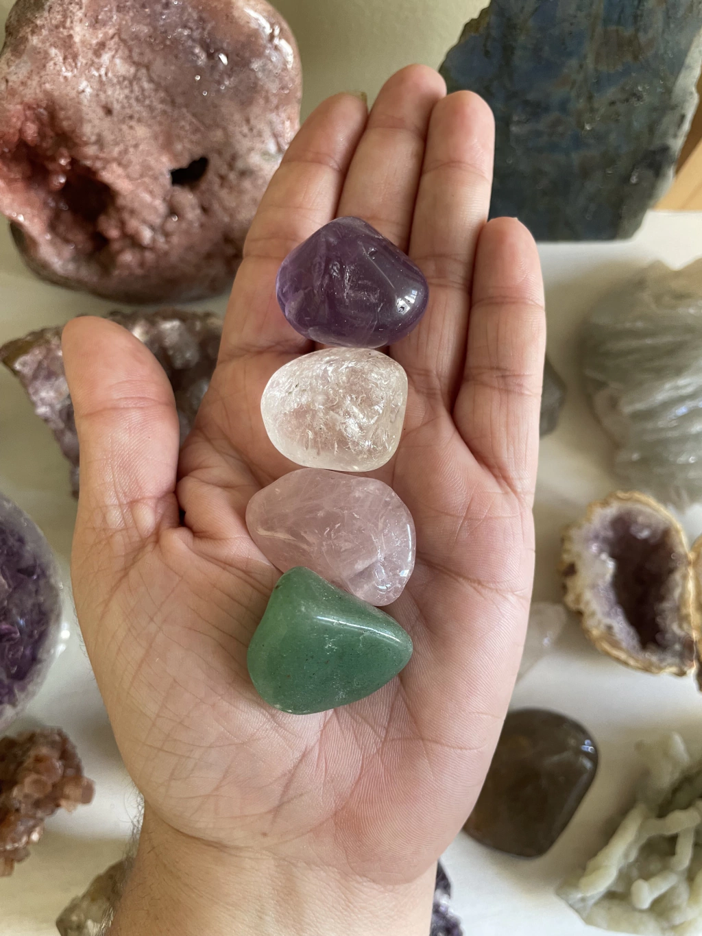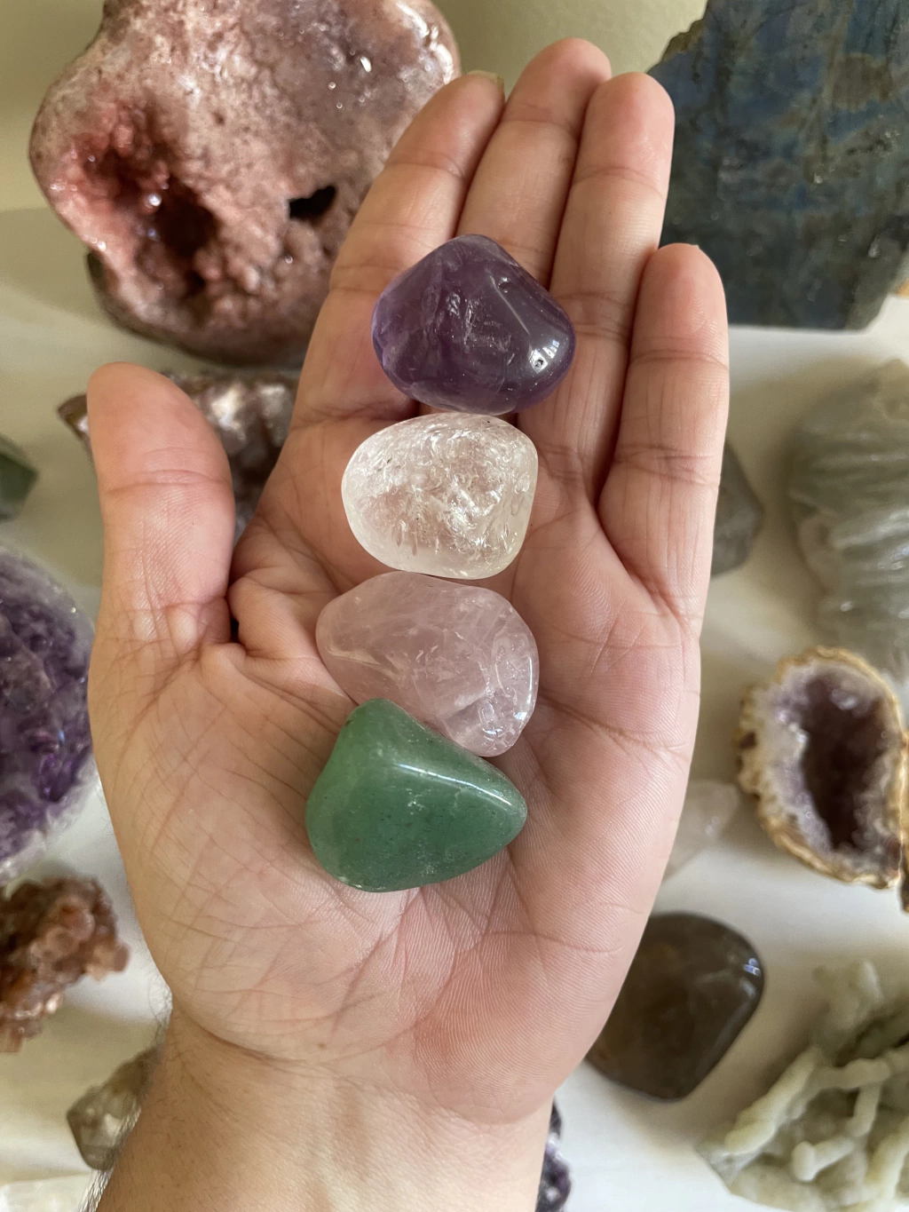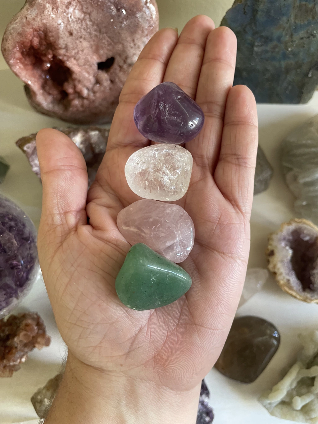 São 4 cristais rolados, com: Ametista, Quartzo natural, rosa e verde.