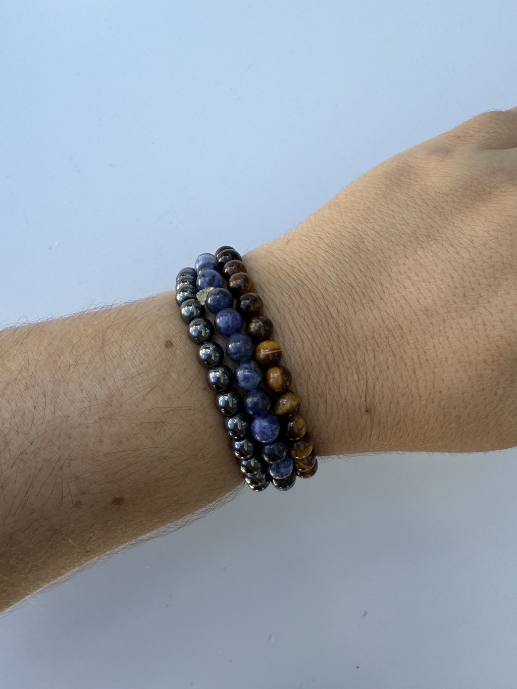 O kit contém 1 pulseira de Sodalita, 1 pulseira de Olho de Tigre e 1 pulseira Hematita.