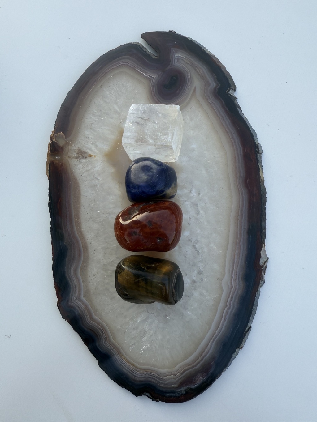 O kit contém: Sodalita, Olho de Tigre, Cornalina e Calcita Ótica