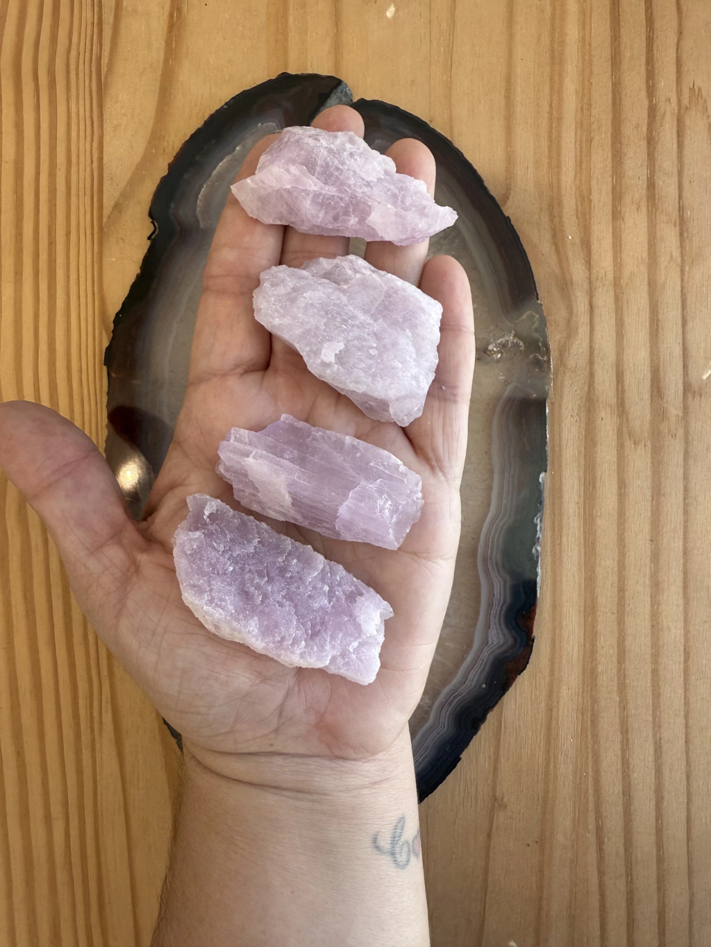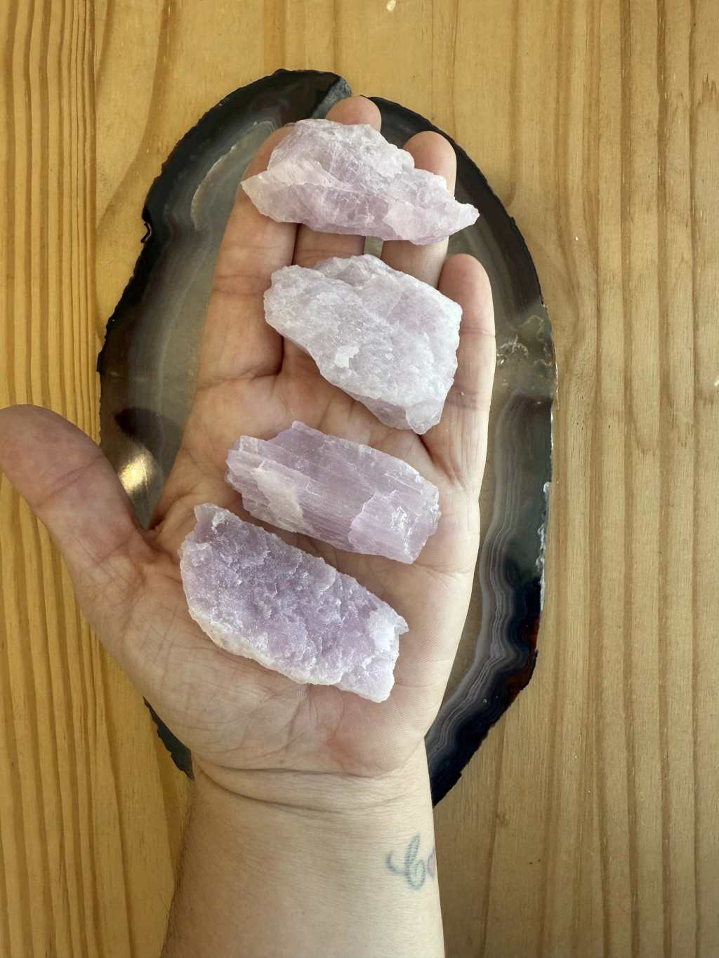 A Kunzita manifesta o estado maduro do coração quando este está equilibrado, aberto, desobstruído de mágoas e rancores, amoroso, compassivo, transformando inseguranças e inibições em atos de amor para que estas virtudes sejam expressões honestas para o mundo exterior. A Kunzita é a representação da perfeição e equilíbrio emocional interno, suas estrias são “caminhos” fáceis de deslocamento de energia a uma velocidade extremamente rápida, automaticamente elevando a vibração de quaisquer emoções, dissipando e dissolvendo energias mal qualificadas e inferiores. Sua coloração do rosa claro ao violáceo ajuda a criar um equilíbrio entre a mente (sétimo chakra/violeta) e o coração (chakra cardíaco/rosa) direcionando a energia do quarto para o sétimo chakra, transmutando padrões de pensamentos associados ao bloqueio emocional.