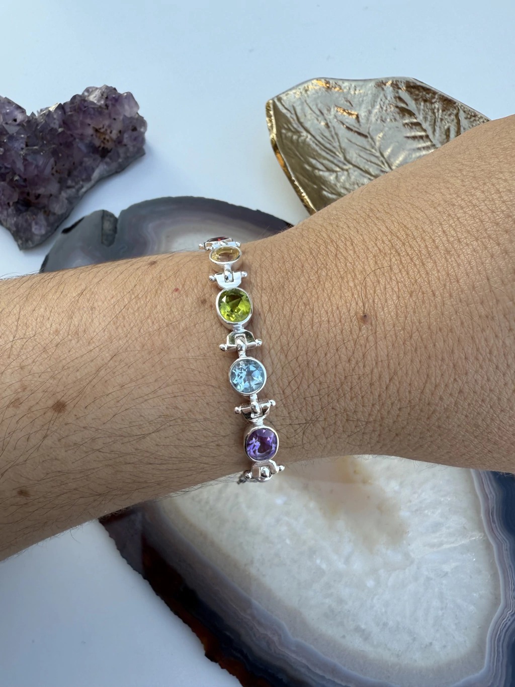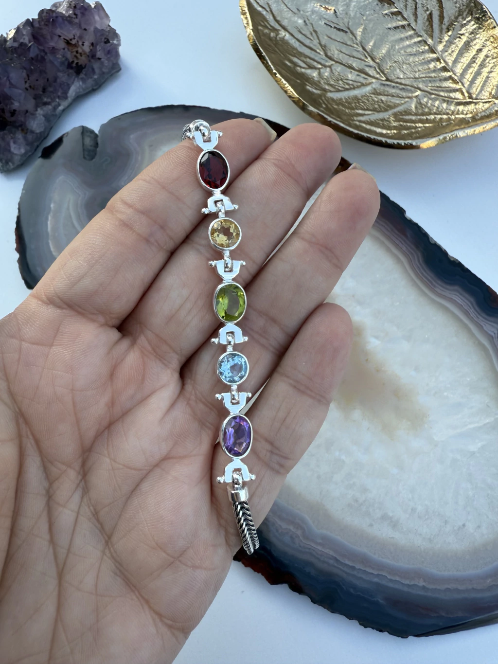 Pulseira 5 Cristais Facetados em Prata 925 - Granada, Topázio Azul, Topázio Imperial, Ametista e Peridoto