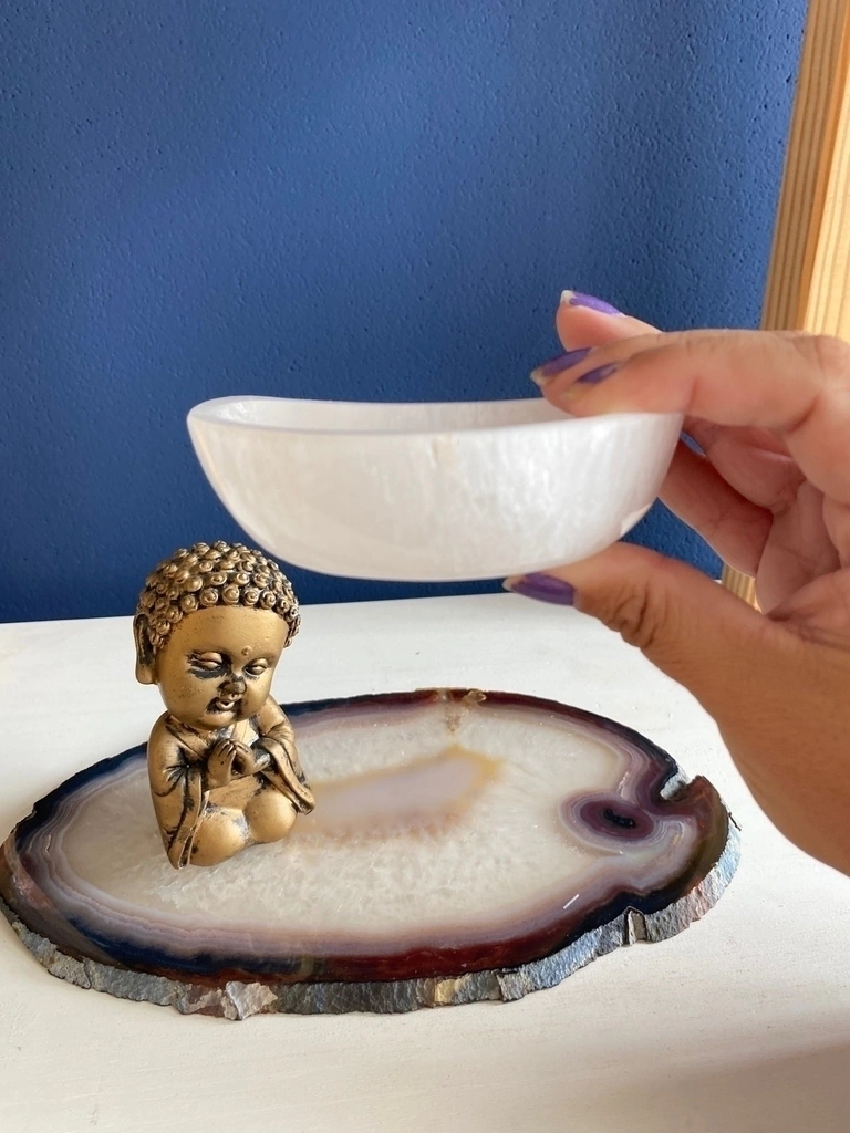 Use o BOWL para limpeza energética dos seus cristais e acessórios cristalinos, acomode os cristais que você quer limpar energeticamente dentro do BOWL e deixe-os acomodados por ali aproximadamente 30 minutos.