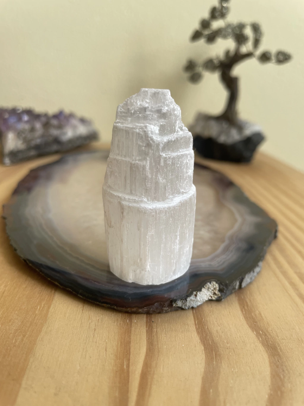 Ela não só purifica pedras e cristais, mas também limpa objetos e até mesmo nossa Aura. Para purificar seu cristal, basta colocá-lo encostado na Selenita e deixá-lo até sentir que já foram energizados.